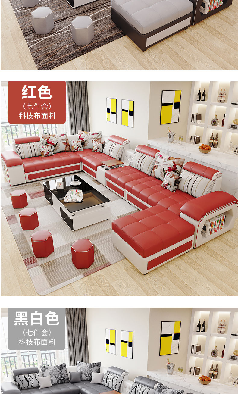 革叡布芸ソファーの大きさと部屋型の組み合わせは、リビング全体の回転角機能布芸ソファーのベージュ(皮+科学技術布)の2つのセット+カーペット+4つのベンチを取り外すことができます。